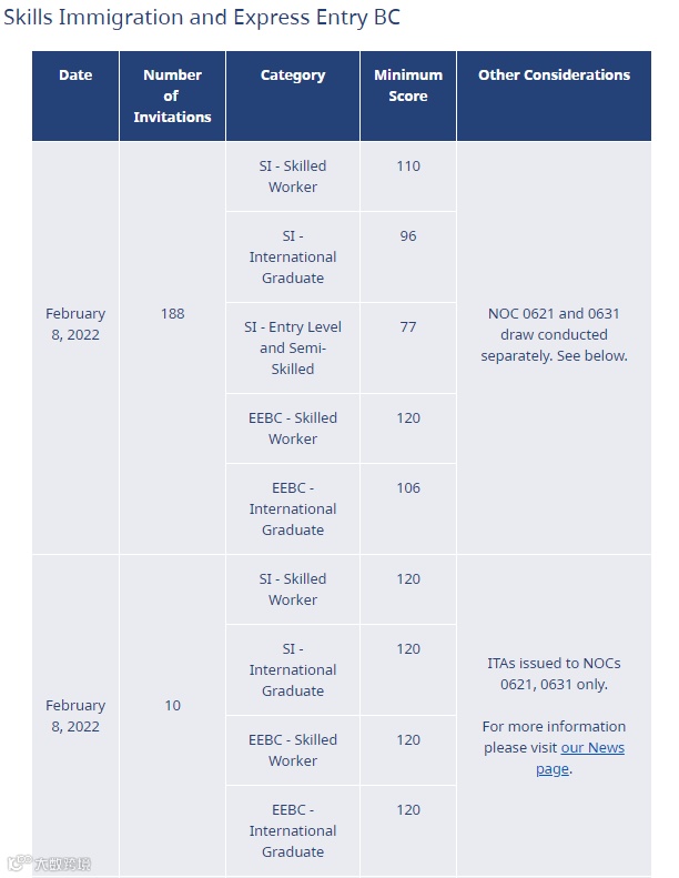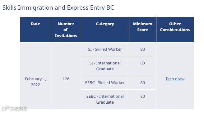 加拿大当地时间 2022年2月1日,BC省移民局进行新一轮技术移民 (仅针对29个特快审批职业) 抽选:本轮抽选共计发出126份邀请, 常规雇主担保类项目抽选分数线80分, 所有类别分数与上期一致。