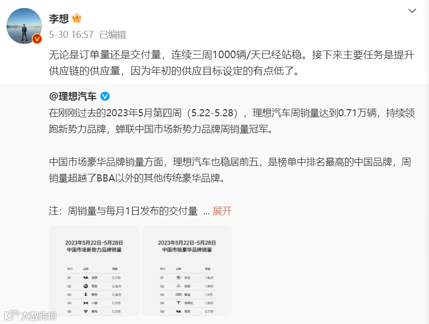 今年前5个月,理想汽车分别交付1.51万辆、1.66万辆、2.08万辆、2.57万辆、2.83万辆,尤其连续三个月交付突破2万辆,数据亮眼。5月30日,他发了一条微博称,“无论是订单量还是交付量,连续三周1000辆/天已经站稳。接下来主要任务是提升供应链的供应量,因为年初的供应目标设定的有点低了。”