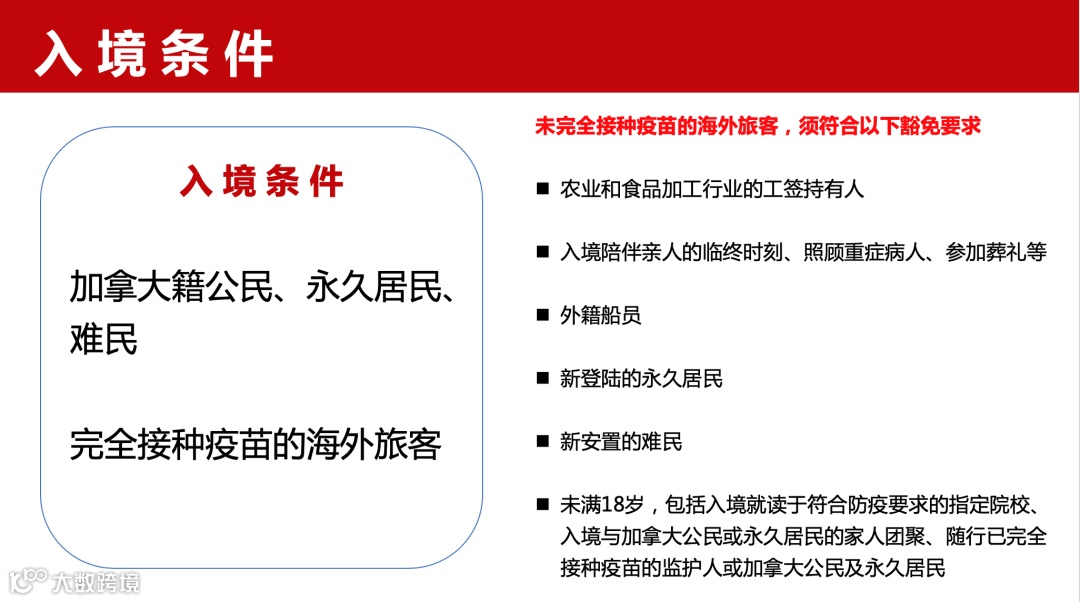 从2021年1月15日开始,加拿大边境管理局取消了原先的一系列豁免条件,取而代之的是要求入境旅客必须是加拿大认可疫苗的完全接种者。