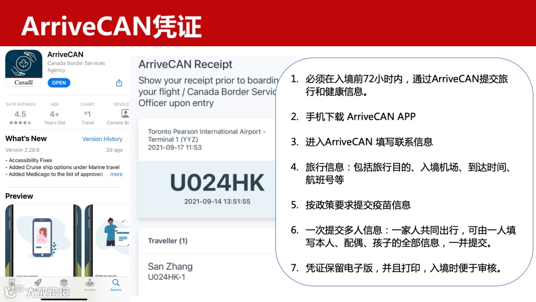 登机前72小时,在手机上下载ArriveCAN,提交旅行信息、隔离计划和联系信息。