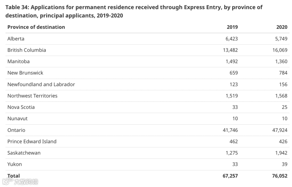 与2019年相比,打算搬到萨斯喀彻温省、BC省和新不伦瑞克省的主申请人数量增加,而打算居住在艾伯塔省和新斯科舍省的申请人数量减少。