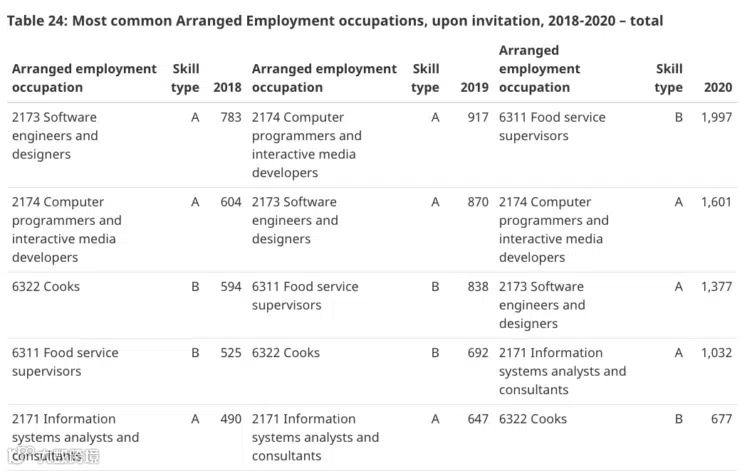 获邀候选人中最常见的是来自于信息技术、商业和金融等相关职业,其次是食品服务主管和行政助理,IRCC表示后者的获邀人数增多主要是由于去年举行了更多场次的CEC单独邀请有关。
