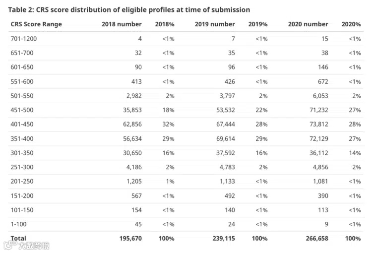 与往年一样, CRS分数在351-400范围内的候选人最多,不过分数位于451-500分的候选人在2020年也大幅增加了。