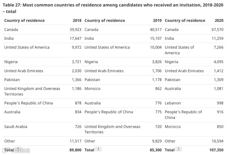 大多数在2020年收到快速通道邀请函的群体来自加拿大境内,占比高达63%,高于2019年的47%。