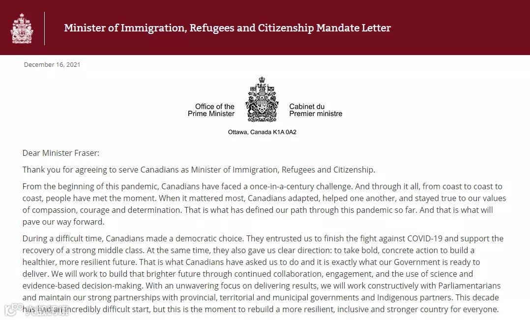 前不久,加拿大总理特鲁多向移民部长颁布了2022年移民任务授权书。