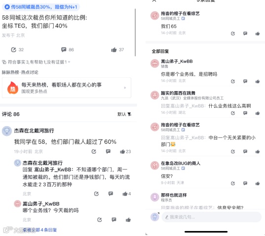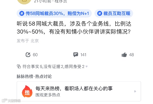 昨晚,职场社交平台脉脉上突然又传出一家互联网大厂裁员的消息:知名全国分类信息网站58同城,裁员30%~50%,涉及各个业务线。