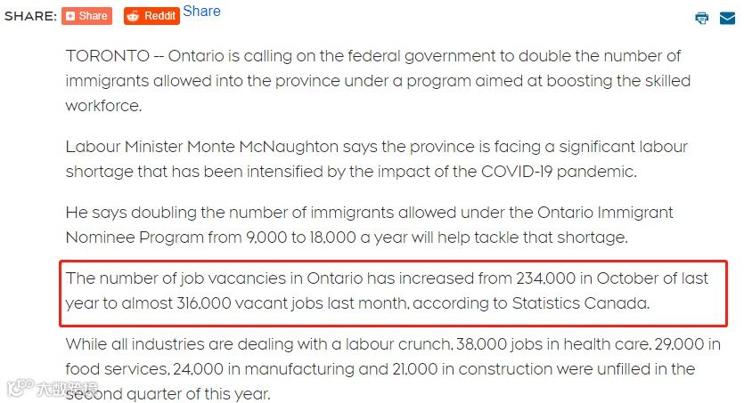 劳工部长蒙特·麦克诺顿 (Monte McNaughton) 更是在新闻发布会上表示,安省的职位空缺数量已从去年10月的234,000个增加到今年上个月的近 316,000 个职位空缺。持续的高职位空缺率将会加大政府推动吸引移民的各项政策,可以说引进新移民势在必行,这也是加拿大解决劳动力匮乏的主要手段之一。安省呼吁联邦政府将安省省提名配额从每年9,000人增加到18,000人来解决这一问题。
