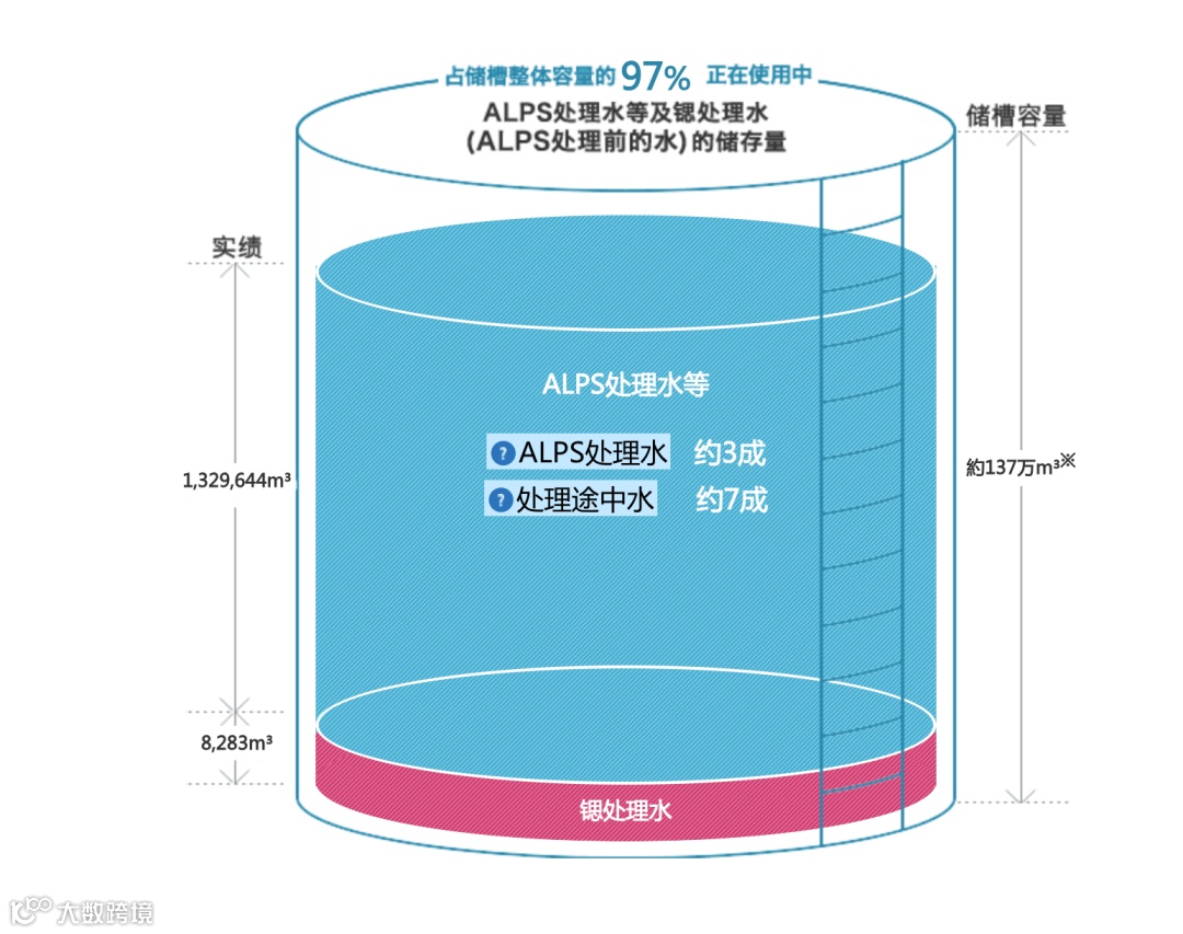 根据东京电力公司官网的数据,其现场的储水能力共约137万立方米。截至2023年5月18日,福岛核电站厂址内已经建了1073座储水槽,其中包括ALPS处理水储槽1033座,锶处理水储槽27座,海水淡化处理水27座,浓缩盐水1座。截至6月29日的最新数据是,储水总量已经达到133.8万立方米,已经达到总储水能力的97%。