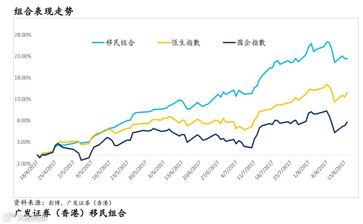广发证券(香港)经纪有限公司(「广发证券(香港)」)自2017年4月18日开始推出广发证券(香港)移民组合,组合起始净值为1000万港元。起始组合中选取10只股票平均配置,组合个股配置比例会在每季度末重新等权重调仓。新加入股票均以调整日收盘价计入组合。如果某只个股仍在组合当中,我们将以每日收盘价来计算表现。调出组合股票之后仍有较大可能再次调入组合,组合经理会根据个股基本面和股价情况考虑择时因素。本组合遵循自下而上的选股策略,组合将每周更新。移民组合在对仓位进行调整时会考虑投资移民客户减仓需要14个自然日买回的入境处规定,我们建议客户将现金部分买入政府ibond作为现金管理。