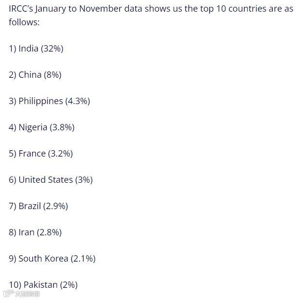 2021年1月至11月期间的数据显示,中国是加拿大第二大移民来源地,占整体移民数的8%。