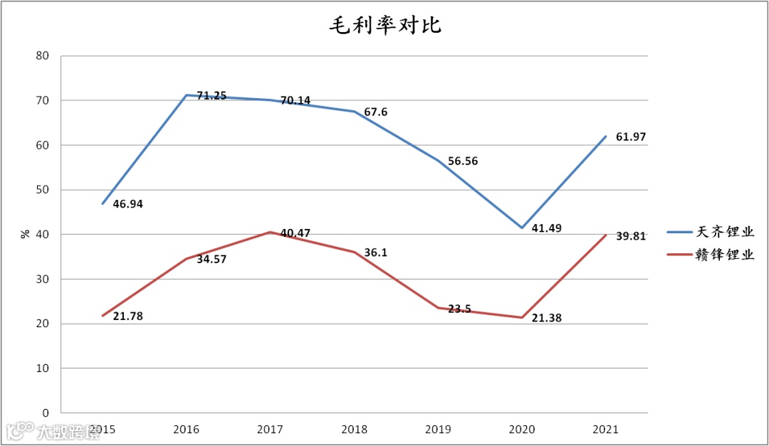 赣锋锂业的锂矿主要用于自供,目前自给率只有40%左右,而天齐锂业家境富裕,不仅原料自给率达到100%,还可直接对外出售锂矿石。也因此,赣锋锂业的利润率一直做不过天齐锂业,且当锂进入上行周期后,拥有更多上游资源的天齐锂业的盈利弹性天然好于赣锋锂业。