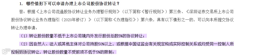 事实上,单笔5%以上的协议转让并不受到限制;在公司持股50%以上,或均受同一控制人所控制的协议转让,则不受“不低于5%”的限制;此外,交易出质人为公司持股2%以上的股东,也可以办理协议转让。