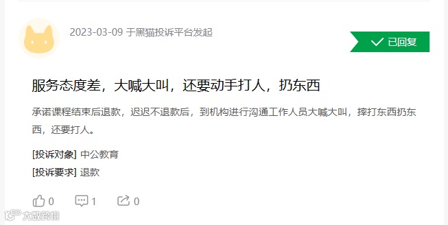 最近30天内,还有近3000名学员在黑猫哭诉拿不到中公的退款,其中一则投诉理由显示:到机构沟通,工作人员服务态度差,还要打人、扔东西。