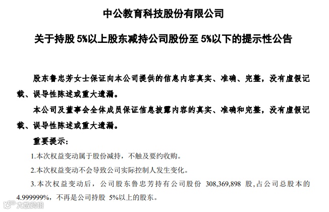 3月1日晚,中公教育发布公告称,实控人鲁忠芳于2023年2月28日,通过大宗交易方式减持公司股份2297万股,约占公司总股本的0.37%。