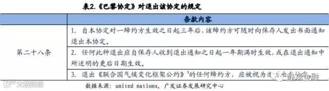 在讨论特朗普退出《巴黎协定》的原因之前,需要先解决另一个问题:《巴黎协定》是否允许缔约国随意进出?根据表2,《巴黎协定》生效3年后,缔约国才能通过书面方式提出退出申请,且在收到退出通知之日起一年期满时生效。由于《巴黎协定》于2016年11月才正式生效,因此从技术层面而言,特朗普无法在2019年11月之前正式提出退出申请,实际退出大概率在2020年生效,但不排除存在一些可能加速退出程序的机制。