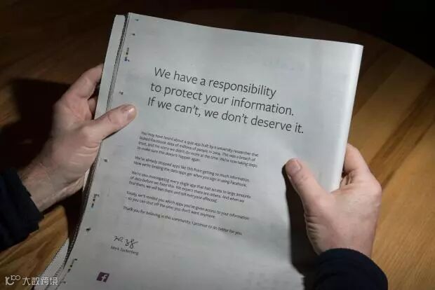 “我们有责任保护你们的信息。如果做不到这一点,就不配得到(你们的信任),” 扎克伯格在一则广告中称,该广告使用了白底黑字的纯文本格式,并带有一个小小的Facebook Logo。