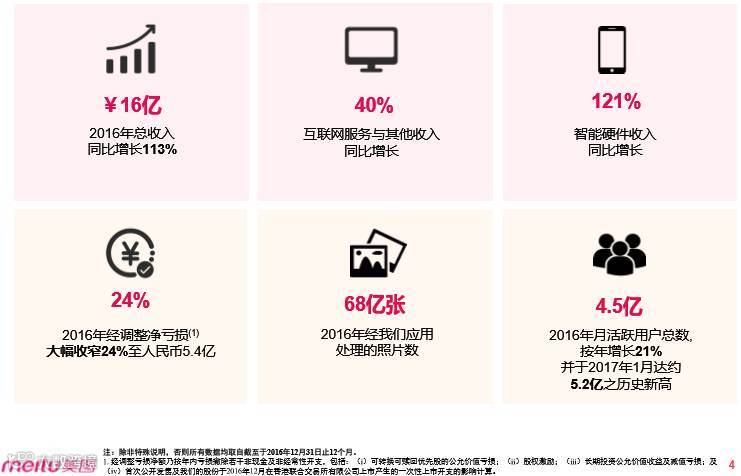 其他收入模式:更多广告的展示位置,更丰富的形式;美拍直播变现展现强劲增长动力,平均每月付费用户人数自 2016 年上半年的 58,000人大幅增至 2016 年下半年的224,536人;创新性活动和功能提高用户活跃度,以及更加完善的美拍生态系统。美图定制,独特的自拍程式个人化体验,透过美图矩阵各app 可直接完成个性化产品定制,并最快于 36 小时內送到家中。