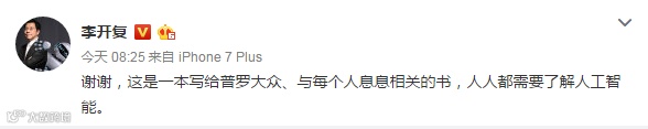 李开复老师出新书啦!新书主题当然离不开这一年多时间里里他见人就谈的主题——人工智能。
