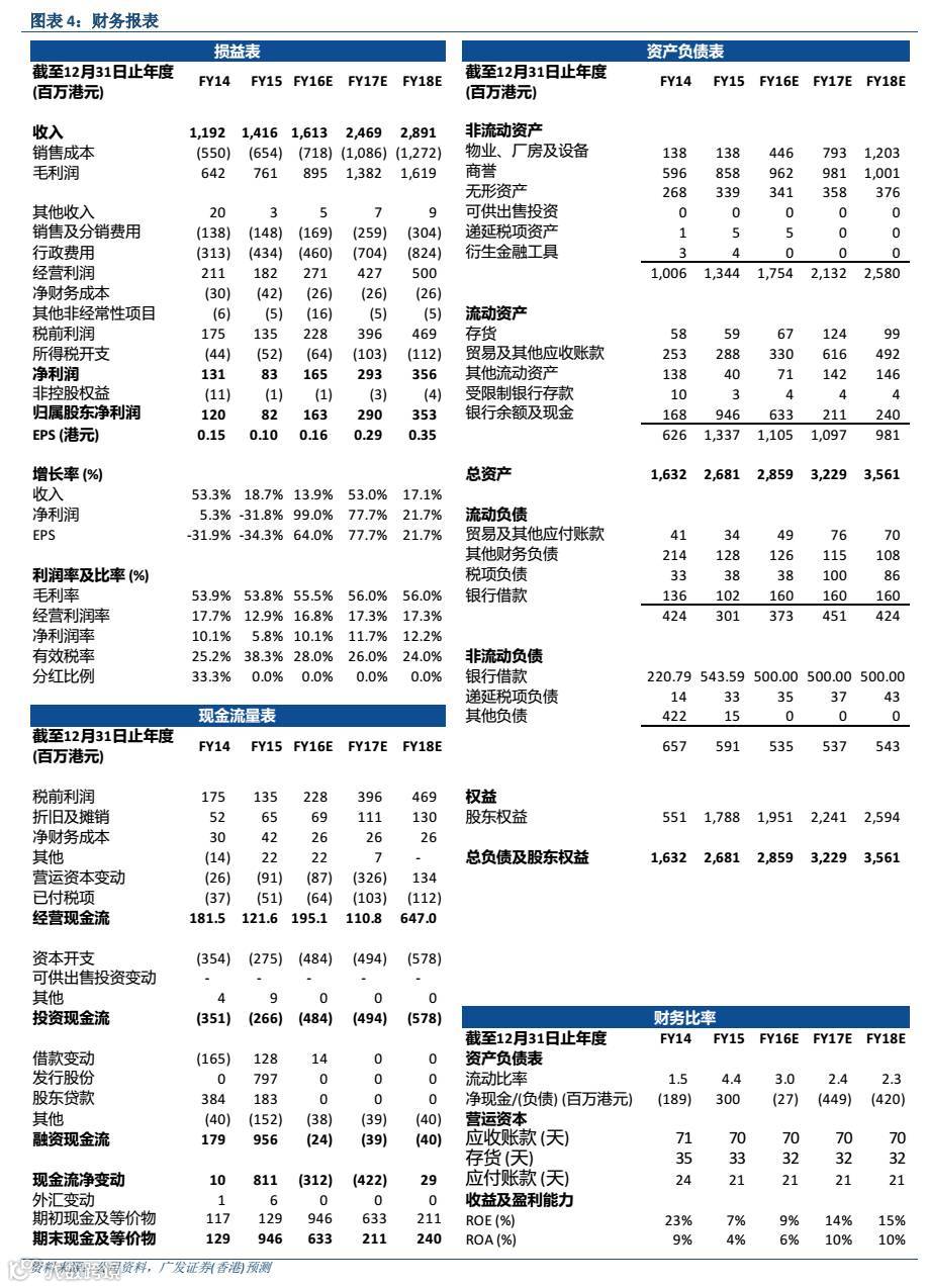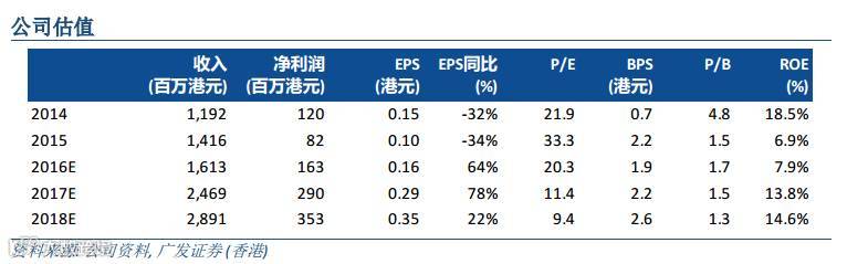 我们预计2016-2018年公司收入复合增长26.9%,而EPS年复合增长率为52.5%。我们认为因为公司增长较快(2017-2019年预测EPS年复合增长率为38%,而行业平均为14%),起码应达到与可比同业一致的估值水平。不过,由于公司上市时间不长,我们以同业平均估值折让30%作为公司的目标市盈率。我们目前的目标价4.50港元隐含36%的上涨空间。