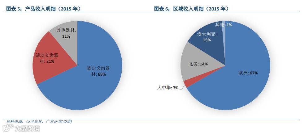 现代牙科是一家专注中端市场的义齿器材生产商,按收入计算在西欧和香港/中国市占率领先。公司业务分布20多个国家,主要集中在发达国家市场;其海外业务占2015年总收入的73%。