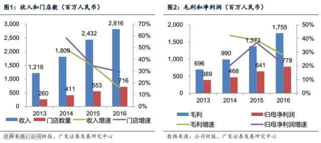 2016年公司的收入人民币为2816.49百万元,同比增长15.8%,毛利为人民币1755.10百万元,同比增长27.8%。归母净利润人民币715.61百万元,同比增长29.5%。EPS为0.37元人民币,同比增长27.6%,建议派息每股人民币0.09元,派息率约30%。期内门店数量从2015年末的641家增长到2016年末的778家,总销量从2015年的30620吨增长7.2%到32830吨。收入增速下滑的主要原因是Q3恶劣天气和产能瓶颈。2016Q3华中地区遭遇恶劣天气导致2016Q3收入同比增长仅7%,根据全年数据推算,2016Q4收入增速约同比20%。另公司的产能利用率在2016年处于高位,导致产品供应无法跟上市场需求。