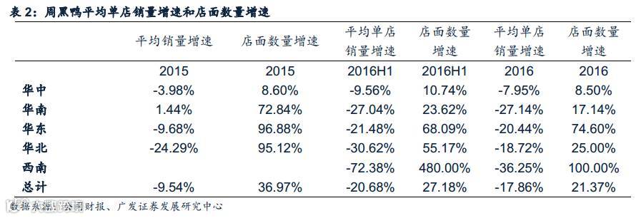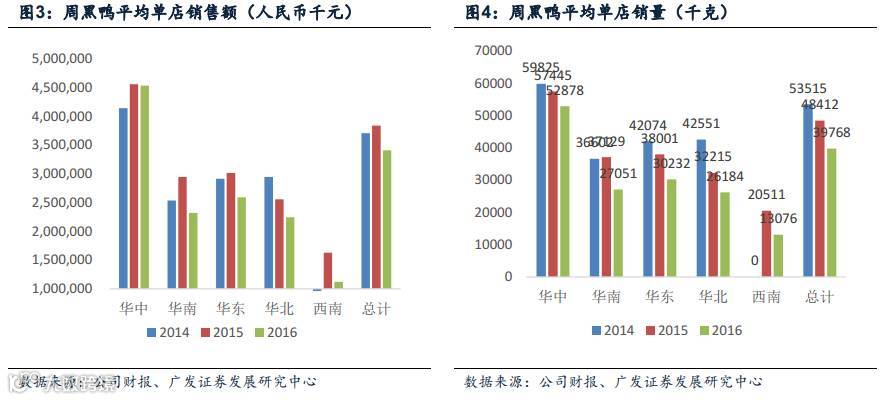 如果2016年上半年和下半年下半年分开看,除华南外所有地区的平均销量下滑均在下半年缩窄,其中华东地区表现较好,在门店数量增加70%左右的情况下,平均单店销量下滑仅20%。该数据显示出华东地区的新店效益较好,对整体的稀释有限。