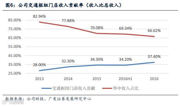 公司门店分布持续优化,华中依赖降低,交通枢纽比例提升。期内公司一共开设190间自营门店,关闭53间自营门店。公司的以交通枢纽门店为主要发展方向的选址战略继续进行,收入占比持续提升。2016年交通枢纽门店贡献收入1052百万元,占总收入比重37.4%,去年同期34.3%。华中地区的收入贡献进一步降低至66.62%。