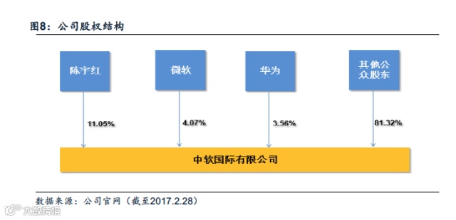 截至2017年2月28日,公司第一大股东为陈宇红,持股比例为11%,微软和华为分别持有公司4.07%和3.56%的股份,其他公众股东持有股份占比合计为81.32%。