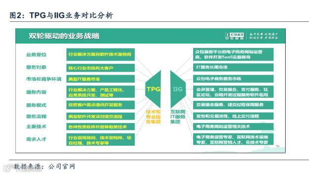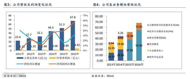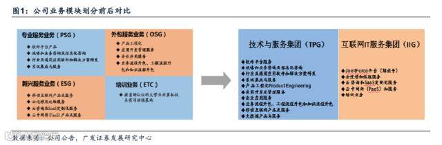 2015年之前,公司业务分为四大板块:专业服务业务(PSG)、外包服务业务(OSG)、新兴服务业务(ESG)和培训业务(ETC);2015年开始,公司根据客户类型和项目类型重新界定了业务模块:技术与服务集团(TPG)和互联网IT服务集团(IIG)。TPG业务主要服务于线下大客户与大行业(包括金融、电信、互联网、交通、能源等重点行业),IIG主要是以JointForce(解放号)为核心面向对价格较为敏感的线上长尾客户(针对政府与制造业等典型长尾市场,重点满足中小型客户和个人的需求)。