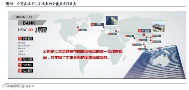 2016年,公司击败Infosys、塔塔等印度IT巨头,成功竞标HSBC全球项目,成为汇丰全球在中国区指定的唯一全球供货商,公司的质量管理能力和交付能力得到了汇丰的高度认可。公司为汇丰在全球多个国家和地区成功交付了多个产品和系统,包括汇丰中国VTM、汇丰中国微信银行、汇丰银行电子税务系统、商业银行在欧洲、中东、北非、北美等地区的数据仓库建设、汇丰银行香港Apple Pay、汇丰中国信用卡系统、汇丰银行深港通等,实现了汇丰业务的全覆盖IT服务。公司与汇丰银行的战略合作为公司拓展其他海外银行业务提供了跳板和契机。
