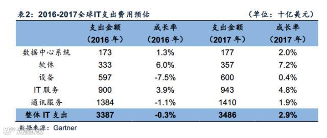 近年来,信息技术服务越来越多受到企业用户的重视,其对信息技术服务的投入也在持续升温。根据国际研究机构Gartner的预测,2017 年全球IT支出预计将达 3.5 万亿美元,较2016年的预估支出3.4万亿美元成长2.9%。相较IT支出2.9%的平均增速,软件和 IT 服务领域已成为IT产业的亮点:2016年软件支出预计将增长6%,并于2017年再增长7.2%,达到3,570亿美元;2016年IT服务支出有望增长3.9%,达到5,970亿美元,并于2017年再增长4.8%,达到9,430亿美元。