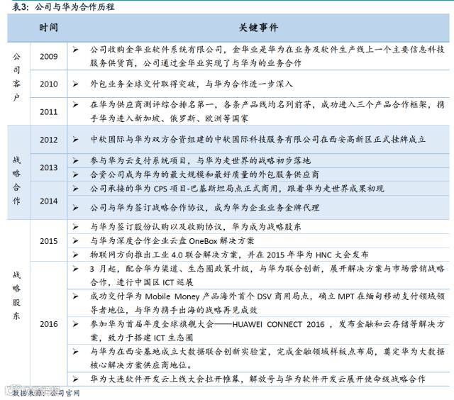 我们认为,当前公司与华为的合作仍在逐步走向深入:根据华为公司的年报,公司从2014年开始已经超越软通成为华为第一大外包服务供应商,而且从数字上来看,这一趋势愈发明显;另一方面公司与华为的合作已不仅仅限于相对基础的通信系统集成、内部业务流程外包和应用软件定制开发等业务,目前二者的合作已步入大型操作系统研发、云服务和国际市场等新领域。
