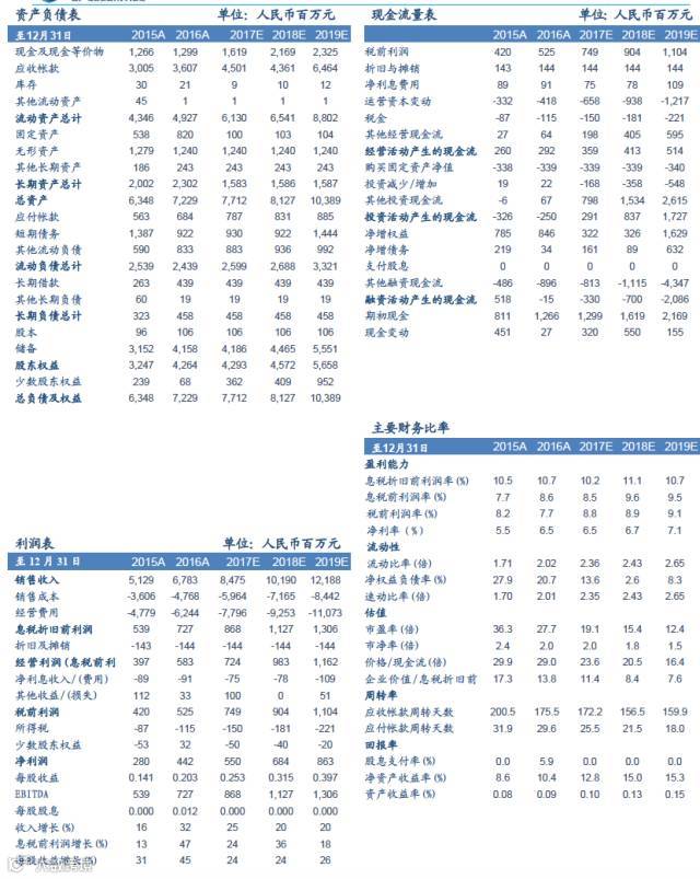 2015-2016年公司整体费用率(包括销售费用率、管理费用率、财务费用率、研发费用率)分比为21.3%、21.6%。我们认为随着公司在大数据、云计算等业务的研发投入力度逐渐加大,公司研发费用率仍有可能逐步提升,但随着公司内部管理效率的逐步提升和财务压力的减轻,我们假设公司整体费用率情况未来三年整体将保持平稳。