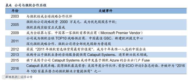 公司是微软在中国第一家“全球首席供货商”和微软全球最有价值供货商,是微软在中国的MCS(微软咨询服务)的优选供货商,也获得了COPC(Customer Operations Performance Center)的认证。同时,公司于2013年收购的Catapult是微软32个解决方案供货商(NSP)之一,其业务专家覆盖微软全线产品。2015年,Catapult获得了11项微软金牌能力和2项银牌能力,并获得了包括20个最有潜力的Azure解决方案供应商在内的多个奖项。Catapul优秀的咨询服务能力为公司与微软的持续合作注入了源源不断的动力。