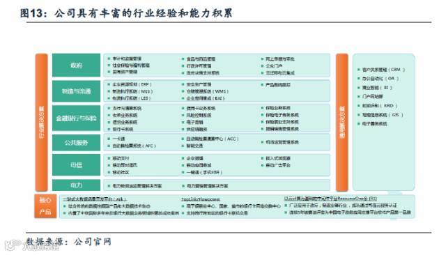在政务领域,公司先后承担了多项国家重点科技攻关项目,并以总集成商的身份在金审、金保、金农、金宏和金卡等多个国家金字号系列工程中取得了非常突出的成绩。公司自主研发的ResourceOne平台亦被CCID评定为中国电子政务应用支撑平台第一产品,公司也由此确立了在电子政务领域的全国领先地位。IDC的报告显示,公司连续多年在政府行业解决方案市场中总体排名持续稳定在前三位的水平。当前公司通过与阿里云合作,又实现了政务云领域的突破,现已成为国内政务云服务领域领先供应商;