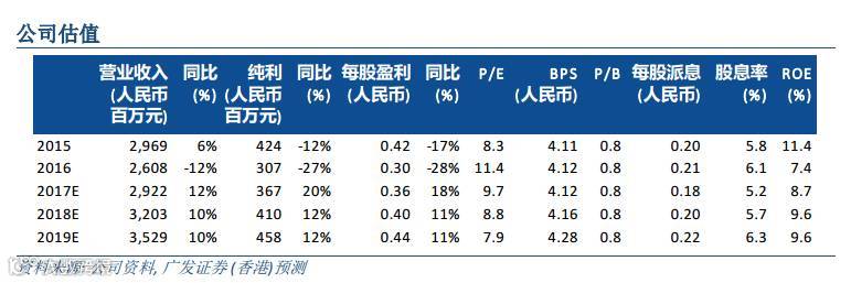 公司目前股价对应11.4倍历史市盈率,股息率6.1%。不过,我们认为,公司2017年缺乏短期催化剂,前景仍然好坏参半。我们预计2017年收入增长10%至29.2亿元人民币,净利润上升20%至3.67亿元,每股收益0.36元。我们将评级从“增持”下调至“持有”,并将目标价从5.00港元下调至4.50港元,基于11倍2017年预测市盈率。