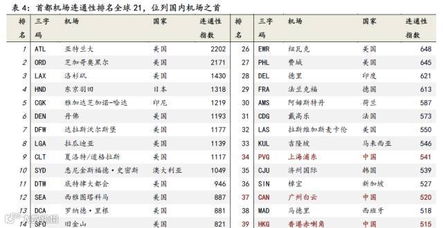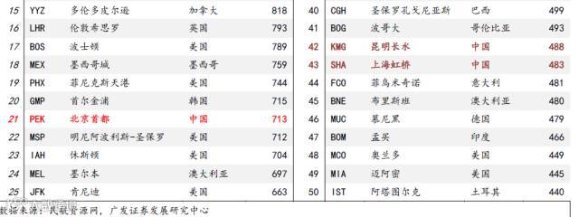 在全球连通性指数TOP50机场中,中国有6家,分别是北京首都、上海浦东、广州白云、香港、昆明长水和上海虹桥机场。其中北京首都机场的连通性指数713,全球排名第21。