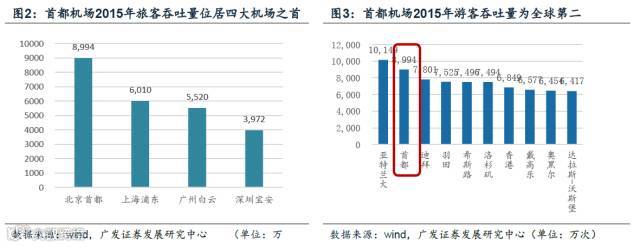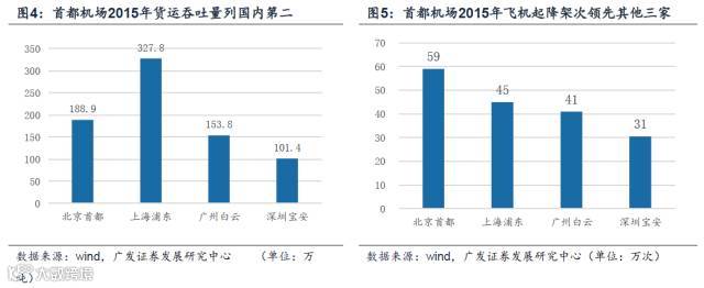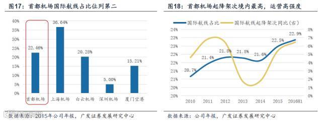 根据中国民航网统计,2015年首都机场旅客吞吐8994万人,居全球第二,货邮吞吐量在国内机场中位列第二,业务量保持大陆机场行业领头羊地位。凭借出色的区位优势,首都机场担当国内、国际战略枢纽角色。其航线网络广、质量优,共有国际通航点129个,领先同行,在欧洲和北美航线市场占绝对优势。