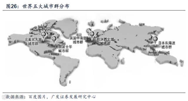 在世界范围内,目前已经发展成熟的城市群主要包括以下五个:美国东北部大西洋沿岸以纽约为中心的城市群,北美五大湖以芝加哥为中心的城市群,日本太平洋沿岸以东京为中心的城市群,英国以伦敦为核心的城市群,欧洲西北部以巴黎为中心的城市群。作为城市重要的公共基础设施,与城市群相伴而生了该地区的机场群。