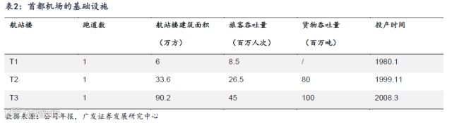 首都机场的基建设施在业内位于前茅,为旅客及货邮吞吐打好基础。首都机场设有3条跑道,共有3个航站楼,共建面达130万方。