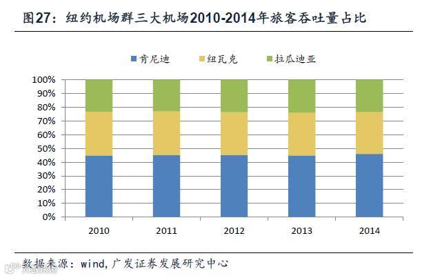 以美国的纽约机场群,该机场群由纽约新泽西港务局管理,是全球最繁忙的空域,包括肯尼迪、纽瓦克、拉瓜迪亚三个大型机场和斯图尔特、大西洋城、体特保罗三个小型机场。肯尼迪机场是其中最大的客运机场,位于纽约皇后区,占地面积近3万亩,始建于1942年,1948年开始运营,是美国重要的客运门户,也是世界领先的大型航空货运中心,主要基地公司有达美航空、捷蓝航空和美国航空,市场份额占到60%,联邦快递、UPS也在肯尼迪机场运营。管理局的6家机场每年为社会创造超过57万个就业岗位、287亿美元的工资报酬和793亿美元的营业收入。