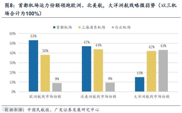 考虑到现阶段我国欧美航线主要分布于首都、白云、上海浦东三大机场,如果将首都、白云、上海三大机场的国际航线合计为100%的话,首都机场在欧洲与美洲航线的占比分别达到53%和47%,占据相当大的比例,其中欧洲航线优势更加明显。由于欧美航线航程长,商务与旅游需求皆稳定充足,故较之亚洲、非洲、大洋洲具有更高的含金量。从各大机场洲际航线的市场份额可以看出,首都机场的国际航线网络拥有一定的厚度。