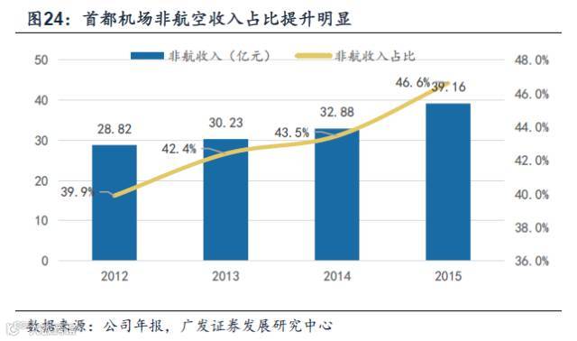 从下图可以看出,首都机场非航空业务收入占比逐年攀升,尤其2015年经营模式变化后,非航收入占比有较大的提升。