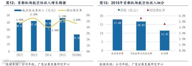4年来,首都机场的航空性收入复合增长率为4.9%。2015年首都航空性收入达45.93亿元,同比+5.2%,其中旅客服务费增长5.1%,源于旅客吞吐量平稳增长;飞机起降及相关收费同比增长5.6%,主要由飞机起降架次增长、航线结构优化及大型机占比增加拉动。