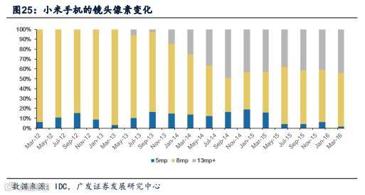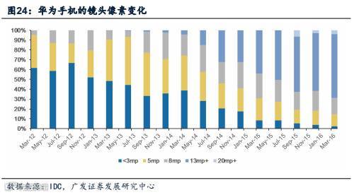 近年来国产手机厂商华为、小米、OPPO、vivo等均不断提升摄像头配置,像素不断提升,从2012年的300万/500万/800万像素发展到2016年的1300万甚至是2000万像素。