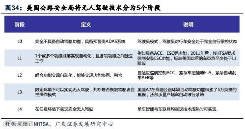 美国高速公路管理局(NHTSA)将无人驾驶技术划分了5个阶段,分别为无自动化(L0级)、个别功能自动化(L1级)、多项功能自动化(L2级)、受限条件下自动驾驶(L3级)和完全自动驾驶(L4级)。