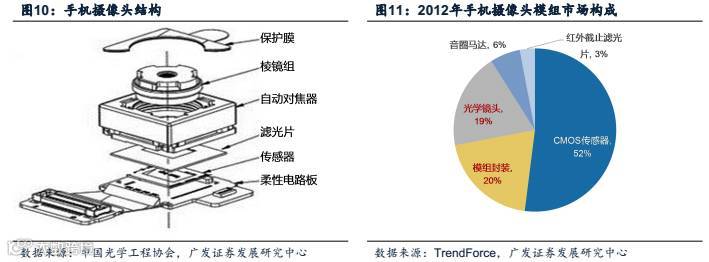 根据市场调研机构TrendForce2012年的数据,CMOS传感器市场在手机摄像模组中的价值占比最大,达到52%,也是这个摄像模组中技术含量最高,产品附加值最大的部分。其次是模组封装和光学镜头部分,两部分占比相当,合计约39%,随着双摄的采用,摄像模组镜头数量的增加以及封装技术难度的上升,将使得这两个产业链环节附加值提升更快。