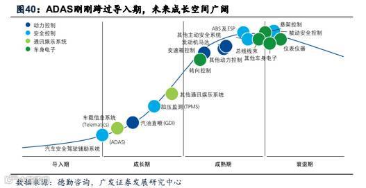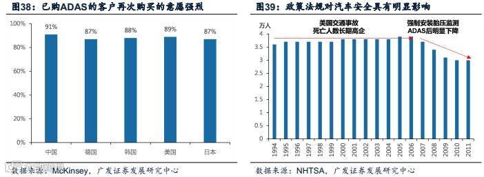 ADAS市场目前尚处于导入期,渗透率还比较低、未来发展潜力巨大。首先,受益于以无人驾驶为代表的智能交通趋势,ADAS作为基石性功能,将有望迎来需求的爆发;其次,立法与安全评级对ADAS的需求刺激显著。政策法规对汽车安全的影响在历史上已有先例。例如,2006年美国要求新车型强制安装TPMS(Tire Pressure Monitor System,轮胎压力监测系统),这一要求直接导致了已多年高企难下的交通事故死亡人数的大幅下降。而ADAS对行车安全的作用明显,将得到市场越来越多的关注和认可。未来,随着更多功能的ADAS的出现,行车安全性将得到大大改善,用户对ADAS的接受度也将得到提升,ADAS渗透率也将实现快速提高。