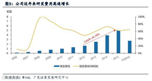公司上市以来,营业收入保持高速增长,从2006年的9.03亿元增长至2015年的107.10亿元,近5年营收增长率维持在25%-60%的高水平,净利润增长率则维持在30%以上,并且在2014年、2015年度不断攀升。2016年上半年营收59.16亿元,同比增加27.01%,净利润4.65亿元,同比大增51.23%。
