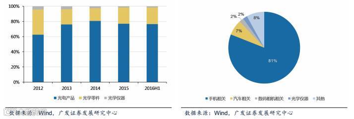 光学元件方面,出货量增长迅速,产品结构不断改善。2016年上半年,800万像素及以上产品出货比例由去年同期的10.5%上升至37.2%,1300万像素广角、1600万像素大光圈及千万像素以上6P镜头均已开始量产。2015年公司主营构成中光学元件占比为21.21%,光学仪器占比为1.97%,毛利率水平从2013、2014年的25%左右增长至2014、2015年的30%左右。